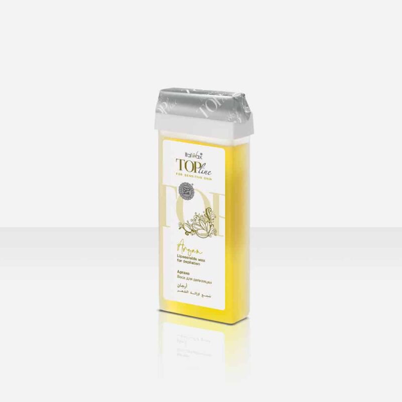 Di altissima qualità, Italwax Top Line Argan è una cera ibrida in cartuccia da utilizzare con le strisce. Questa cera roll on, a base di resine sintetiche, olio di argan e di biossido di titanio, è indicata per la depilazione della pelle sensibile. Di colore giallo acceso e dalla texture opaca, sprigiona un delicato profumo di argan che rende più piacevole l’applicazione. Da utilizzare per la depilazione delle zone più estese, come braccia e gambe, è un grande alleato nel lavoro di tutte le estetiste. È una cera rivoluzionaria che offre tutta la praticità d’uso della cera liposolubile e le performance di una cera brasiliana. Le cartucce di cera Top Line non colano, non appiccicano e hanno una temperatura di fusione di soli 38 °C. Italwax Top Line Argan è estremamente efficace per la rimozione dei peli, anche corti, ispidi e pre rasati, eliminandoli fin dal primo strappo. Appositamente formulata per rispondere alle esigenze della pelle più sensibile, non contiene resine naturali che possono portare ad arrossamenti e irritazioni. L’applicazione della cera è nel senso di crescita del pelo e lo strappo avviene con le strisce: con una sola applicazione è possibile rimuovere fino al 100% dei peli, anche quelli più corti che una classica cera liposolubile non può rimuovere.
