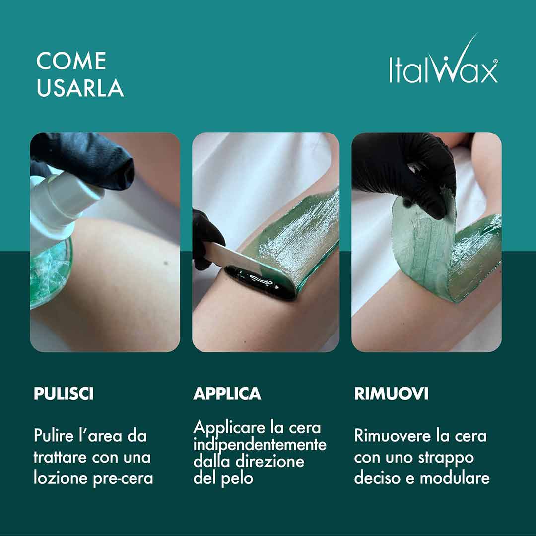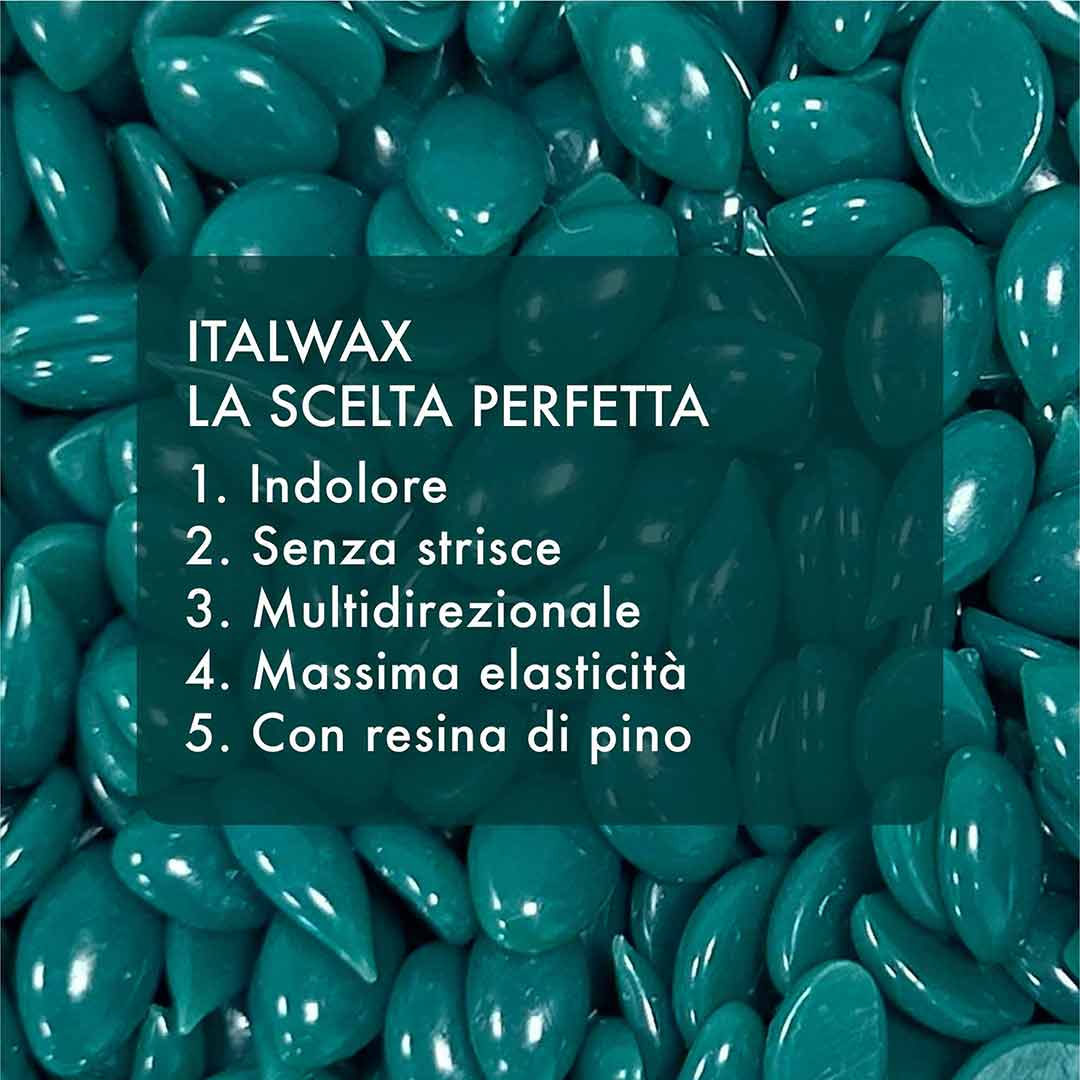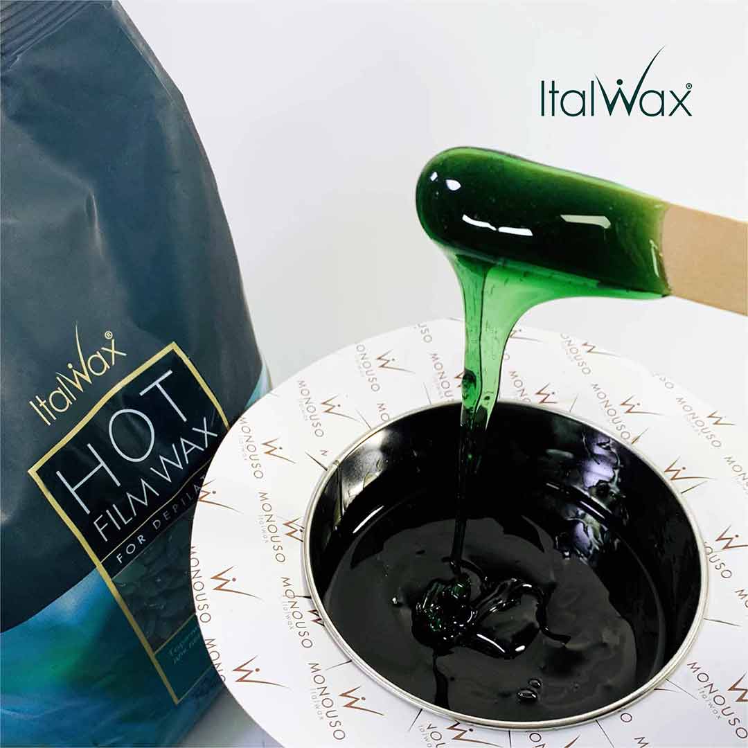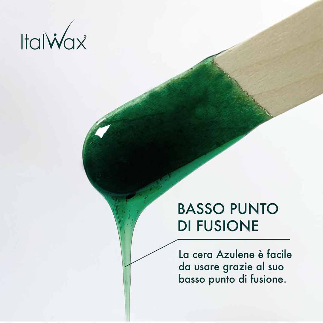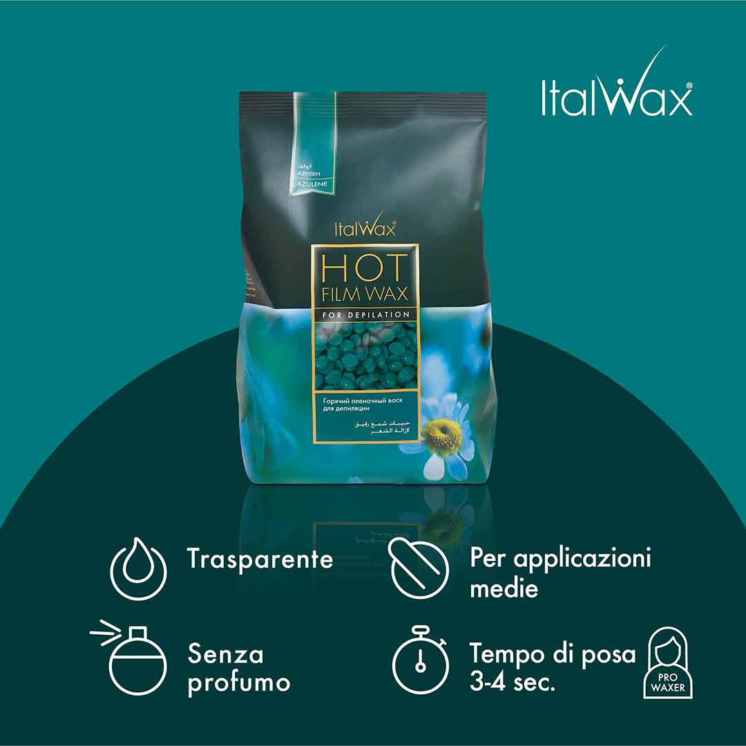 Italwax Film Wax Azulene è una cera brasiliana trasparente e senza profumo, formulata a partire da resine naturali. Azulene ha una texture sottile, di un bel colore blu-verde. Il suo tempo di indurimento breve (4-6 secondi), consente alle estetiste più esperte di velocizzare la procedura di depilazione. Efficace nel rimuovere i peli spessi e corti, è ideale per una ceretta efficace e indolore di ascelle e di tutta la zona bikini.