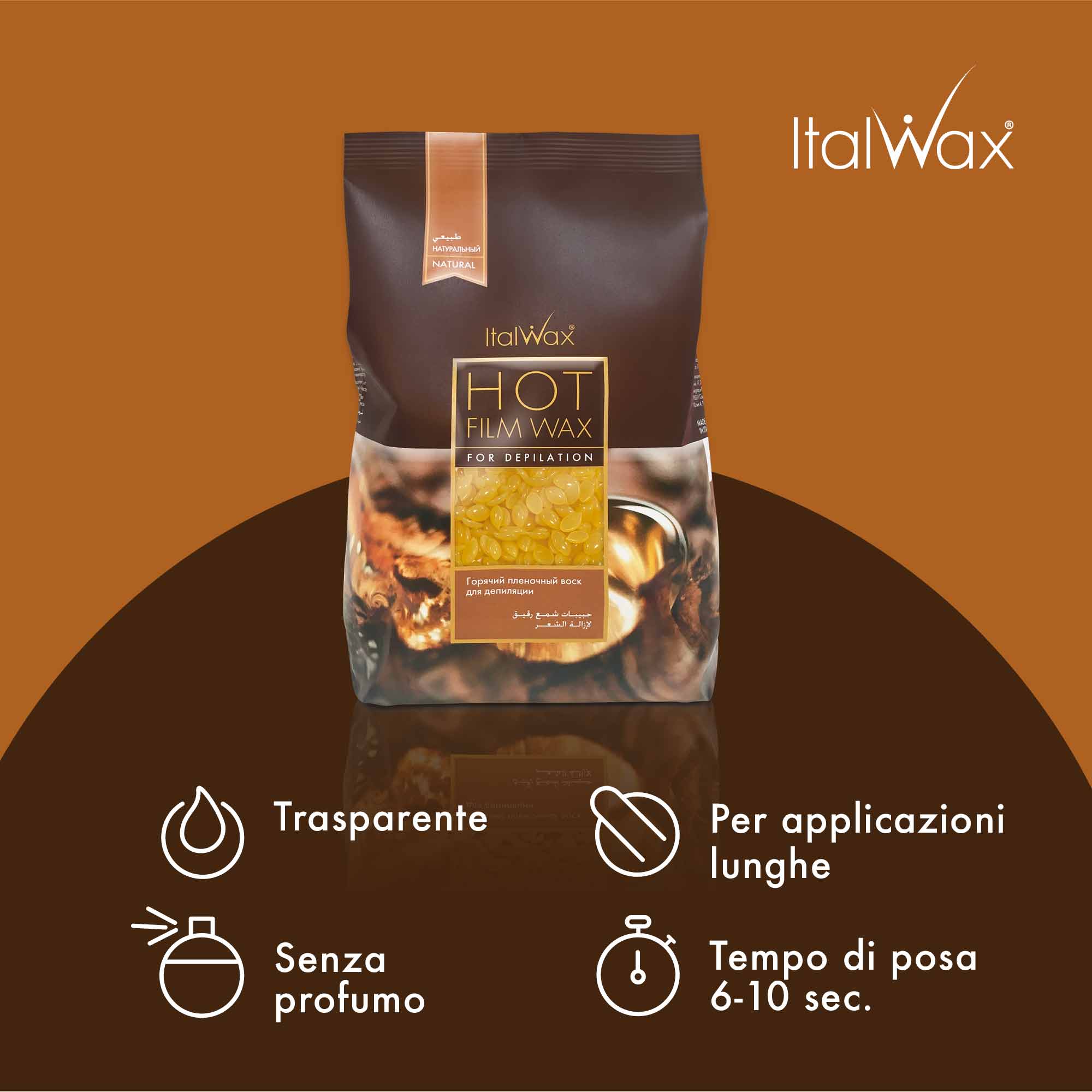 Italwax Film Wax Naturale è una cera film trasparente. I suoi granuli hanno il colore della resina naturale, che sta alla base della sua eccellente formulazione. Le sue materie prime accuratamente selezionate rendono questo prodotto elastico, performante e facile da utilizzare. Una volta scaldata, la cera diventa trasparente e lascia intravedere la zona tratta. Si scioglie a 42°, una temperatura relativamente bassa che aumenta il comfort d’utilizzo, anche nelle zone più delicate. Flessibile, malleabile, multidirezionale questa cera brasiliana in granuli segue facilmente le forme naturali del corpo rendendo più semplice la depilazione dei punti difficili.