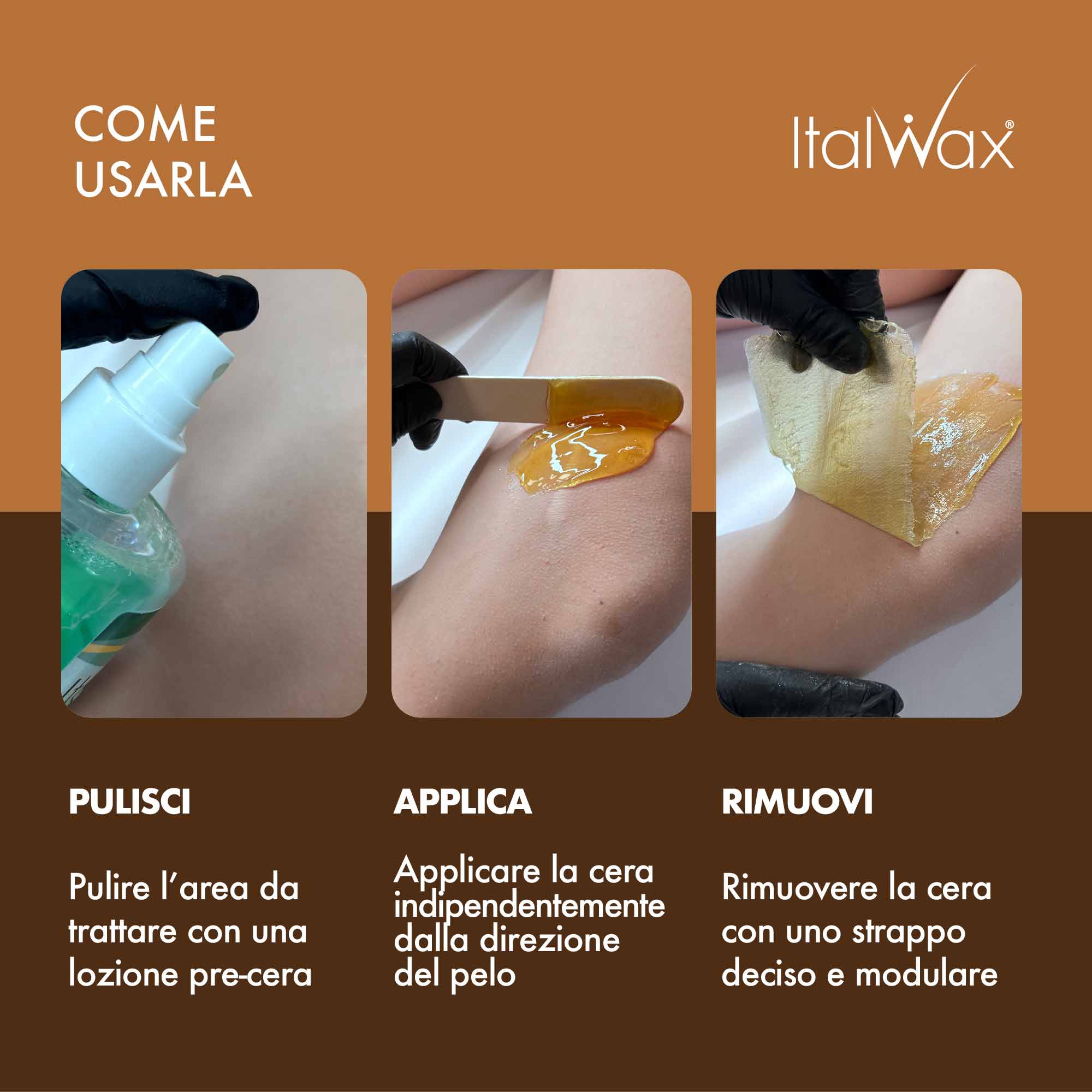 Sciogliere la cera impostando una temperatura di 60°C circa e non appena la maggior parte dei granuli si sarà fusa settare il termostato a 40/45 °C per raggiungere la consistenza perfetta per un utilizzo corretto e sicuro.Nel frattempo, trattare l’area da depilare con una lozione pre cera Italwax seguita da una piccola quantità di talco cosmetico. Utilizzare una spatola per applicare uno strato uniforme e sottile di cera. Creare un piccolo lembo da utilizzare come impugnatura per lo strappo. La cera multidirezionale si applica indipendentemente dalla direzione di crescita dei peli. Aspettare 10/12 secondi che si indurisca: in questo tempo è possibile correggere eventuali errori. Strappare la pellicola di cera in maniera decisa e modulare, parallelamente alla pelle, in direzione contraria a quella in cui è stata stesa. Continuare su tutte le zone da depilare e terminare con l’applicazione di un prodotto post cera Italwax calmante, rinfrescante e privo d’olio. Lo strappo avviene senza l’uso strisce depilatorie.